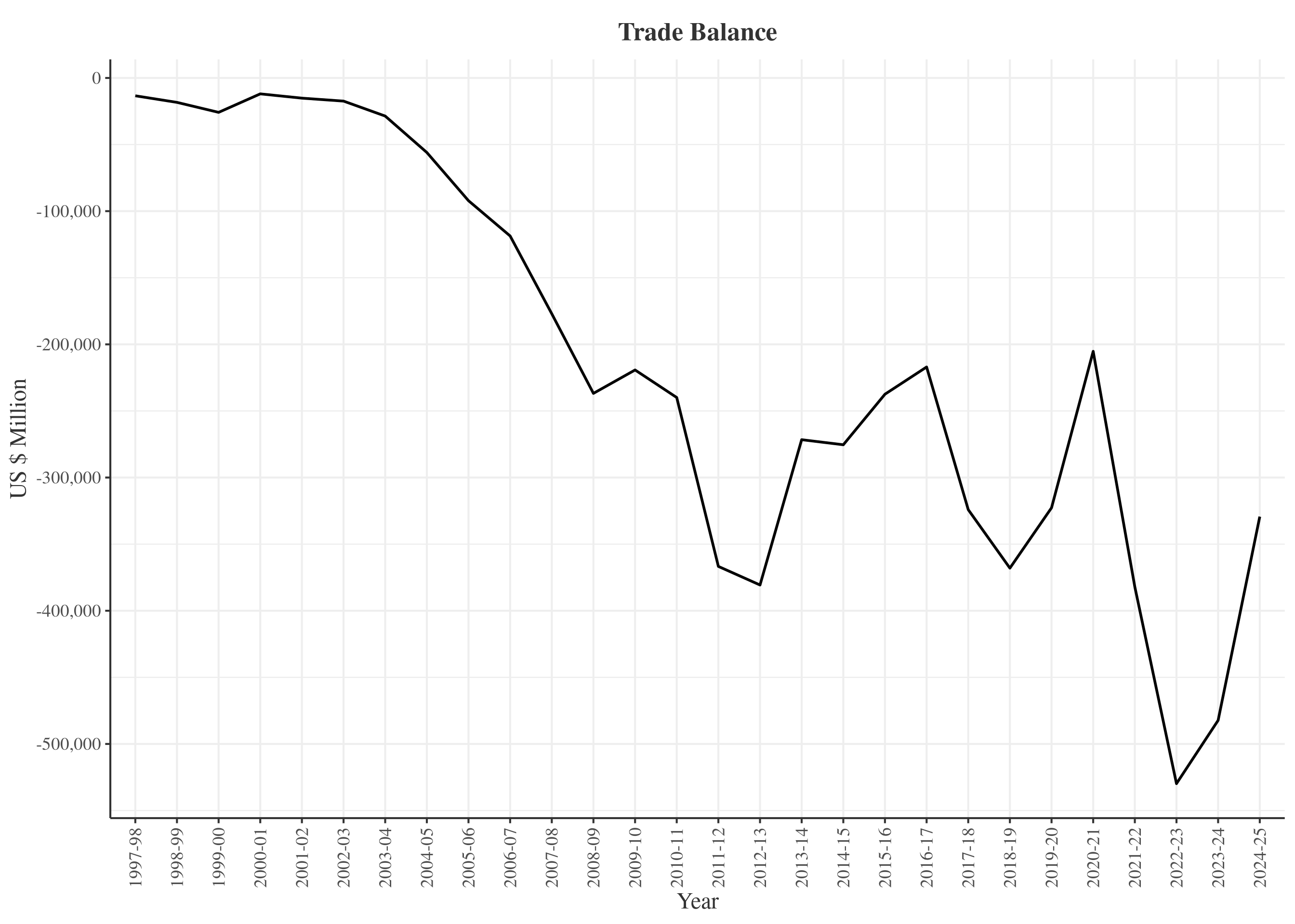 ggplot(trade, aes(x = Year, y = Trade_Balance, group = 1)) +