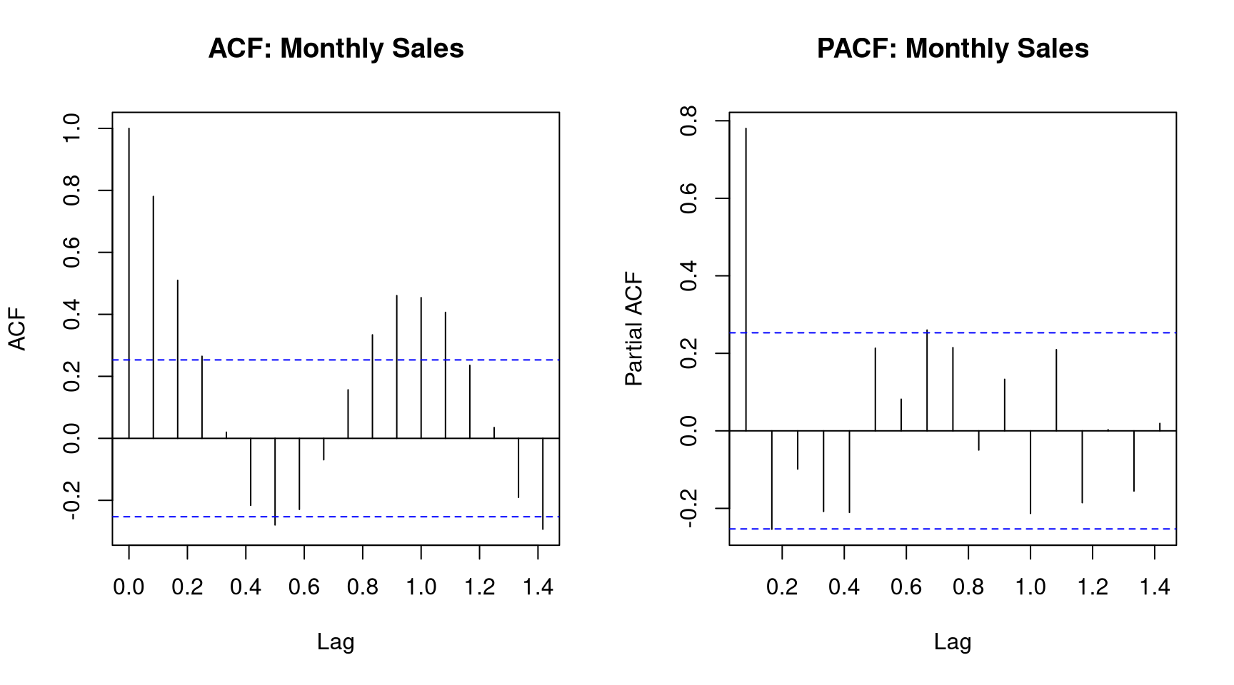 par(mfrow =c(1, 2))acf(monthly_sales, main ="ACF: Monthly Sales")pacf(monthly_sales, main ="PACF: Monthly Sales")par(mfrow =c(1, 1))
