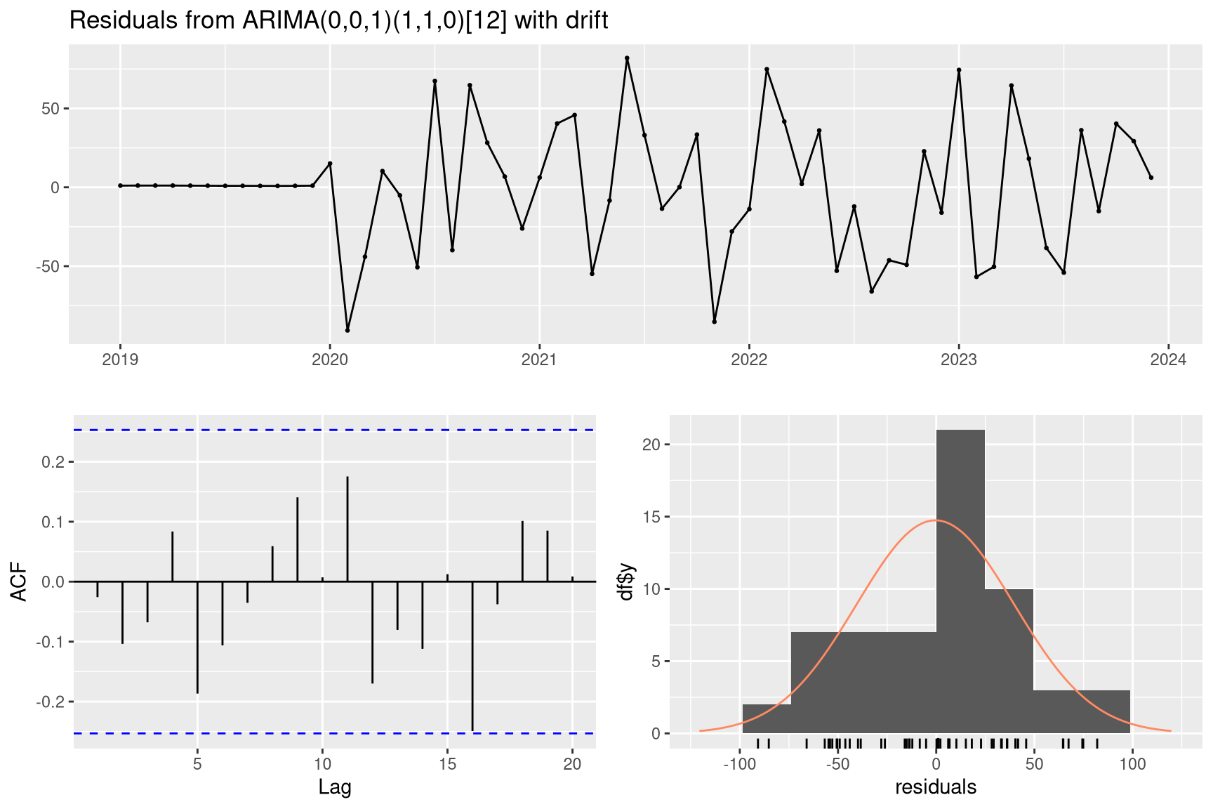 checkresiduals(m_arima)#> #> Ljung-Box test#> #> data: Residuals from ARIMA(0,0,1)(1,1,0)[12] with drift#> Q* = 10.991, df = 10, p-value = 0.3582#> #> Model df: 2. Total lags used: 12