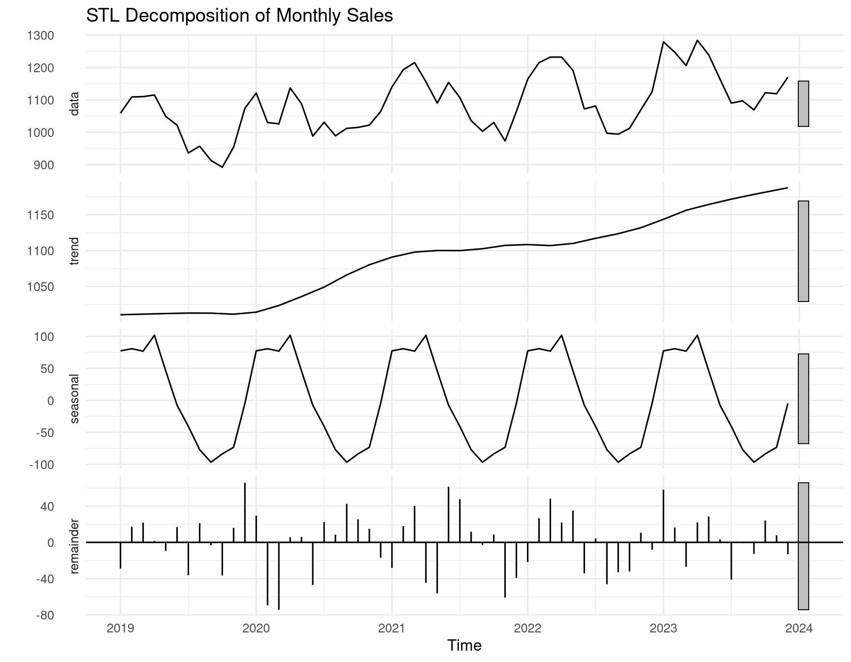 Decompose the price series using STL. Plot the components and estimate the seasonal strength.