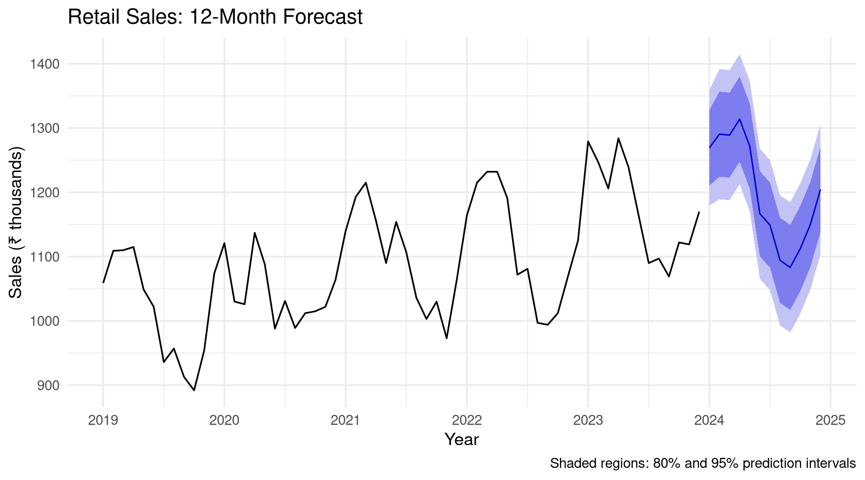 forecast_result<-forecast(m_arima, h =12)autoplot(forecast_result)+labs(title ="Retail Sales: 12-Month Forecast", x ="Year", y ="Sales (₹ thousands)", caption ="Shaded regions: 80% and 95% prediction intervals")+theme_minimal(base_size =13)