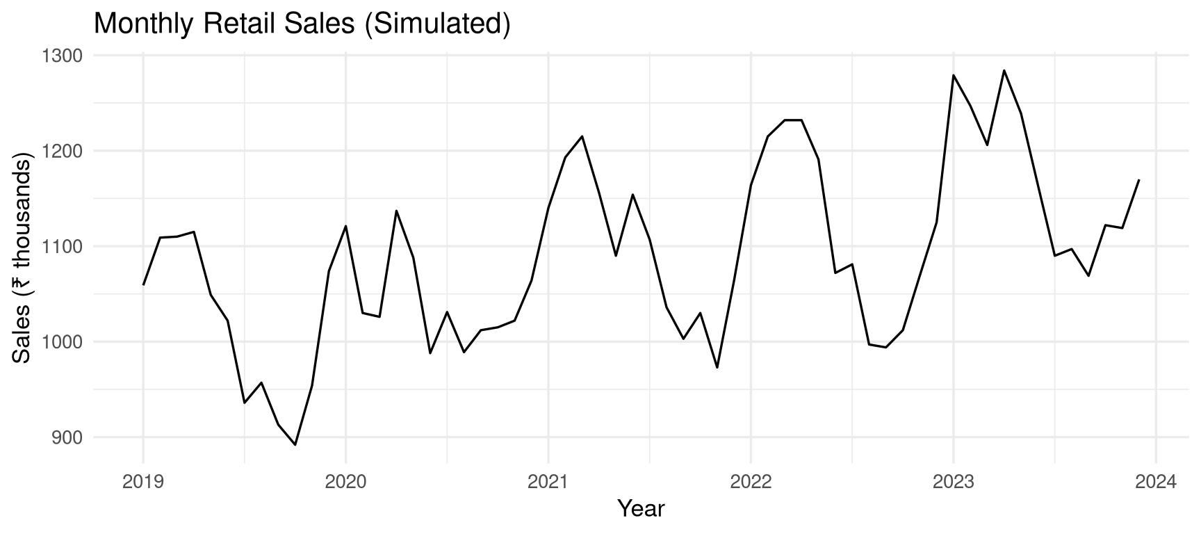 # Time Series Analysis {#sec-timeseries}```{r}#| label: setup-ch14#| include: falselibrary(tidyverse)library(forecast)library(tsibble)library(feasts)set.seed(42)```::: {.callout-note}## Learning ObjectivesBy the end of this chapter, you will be able to:- Create and manipulate time series objects in R- Decompose a time series into trend, seasonal, and remainder components- Test for stationarity using the ADF test- Fit ARIMA models using `auto.arima()`- Produce and visualise forecasts with confidence intervals:::## Time Series Objects {#sec-ts-objects}```{r}#| label: ts-create# Base R ts object: monthly retail sales (simulated)set.seed(99)monthly_sales <-ts(data =round(1000+seq(0, 200, length.out =60) +# Trend100*sin(2* pi * (1:60) /12) +# Seasonalityrnorm(60, 0, 40)), # Noisestart =c(2019, 1), # January 2019frequency =12# Monthly)print(monthly_sales)``````{r}#| label: fig-ts-plot#| fig-cap: "Monthly retail sales time series with trend and seasonal patterns."#| fig-width: 9#| fig-height: 4autoplot(monthly_sales) +labs(title ="Monthly Retail Sales (Simulated)",x ="Year", y ="Sales (₹ thousands)") +theme_minimal(base_size =13)```## Time Series Decomposition {#sec-decomposition}### Classical Decomposition {#sec-classical-decomp}```{r}#| label: fig-decomp#| fig-cap: "STL decomposition separating trend, seasonality, and remainder."#| fig-width: 9#| fig-height: 7decomp <-stl(monthly_sales, s.window ="periodic")autoplot(decomp) +labs(title ="STL Decomposition of Monthly Sales") +theme_minimal(base_size =12)``````{r}#| label: decomp-extract# Extract componentstrend <- decomp$time.series[, "trend"]seasonal <- decomp$time.series[, "seasonal"]remainder <- decomp$time.series[, "remainder"]# Seasonal strengthvar(seasonal) / (var(seasonal) +var(remainder))```## Stationarity {#sec-stationarity}Most time series models require **stationarity** — constant mean, variance, and autocovariance over time.```{r}#| label: fig-acf-pacf#| fig-cap: "ACF and PACF plots help identify appropriate ARIMA orders."#| fig-width: 9#| fig-height: 5par(mfrow =c(1, 2))acf(monthly_sales, main ="ACF: Monthly Sales")pacf(monthly_sales, main ="PACF: Monthly Sales")par(mfrow =c(1, 1))``````{r}#| label: stationarity-testlibrary(tseries)# Augmented Dickey-Fuller test# H₀: series has a unit root (non-stationary)# H₁: series is stationaryadf.test(monthly_sales)# If non-stationary, differencing can helpadf.test(diff(monthly_sales))```## ARIMA Models {#sec-arima}**ARIMA(p, d, q)** models combine:- **AR(p):** Autoregressive — depends on p past values- **I(d):** Integrated — d-th order differencing for stationarity- **MA(q):** Moving average — depends on q past errorsFor seasonal data, use **SARIMA(p, d, q)(P, D, Q)[m]**.```{r}#| label: arima-fit# auto.arima selects the best model automaticallym_arima <-auto.arima( monthly_sales,seasonal =TRUE,stepwise =FALSE,approximation =FALSE)summary(m_arima)``````{r}#| label: fig-arima-diag#| fig-cap: "ARIMA model residual diagnostics."#| fig-width: 9#| fig-height: 6checkresiduals(m_arima)```## Forecasting {#sec-forecasting}```{r}#| label: fig-forecast#| fig-cap: "12-month ahead forecast with 80% and 95% prediction intervals."#| fig-width: 9#| fig-height: 5forecast_result <-forecast(m_arima, h =12)autoplot(forecast_result) +labs(title ="Retail Sales: 12-Month Forecast",x ="Year", y ="Sales (₹ thousands)",caption ="Shaded regions: 80% and 95% prediction intervals") +theme_minimal(base_size =13)``````{r}#| label: forecast-accuracy# Hold-out validation: train on first 48 months, test on last 12train <-head(monthly_sales, 48)test <-tail(monthly_sales, 12)m_train <-auto.arima(train, seasonal =TRUE)fc <-forecast(m_train, h =12)# Accuracy metricsaccuracy(fc, test)```## The tsibble Framework {#sec-tsibble}For modern, tidy time series workflows:```{r}#| label: tsibble-demolibrary(tsibble)library(feasts)# Convert to tsibblesales_tsibble <-as_tsibble(monthly_sales)# Decomposesales_tsibble |>model(STL(value ~trend(window =13) +season(window ="periodic"))) |>components() |>autoplot() +theme_minimal(base_size =11) +labs(title ="STL Decomposition (tsibble/feasts)")```## Exercises {#sec-ch14-exercises}1. Download monthly diesel or petrol price data for India from the PPAC website. Import and convert to a `ts` object. Plot the series and describe the trend and any seasonality.2. Decompose the price series using STL. Plot the components and estimate the seasonal strength.3. Fit an ARIMA model using `auto.arima()`. Print the selected order and the model summary.4. Produce a 24-month forecast. Visualise it and write a brief interpretation of the projection.5. **Challenge:** Build a comparison of three forecasting methods — Exponential Smoothing, ARIMA, and a linear trend model — evaluated by out-of-sample RMSE on a holdout set of 12 months.